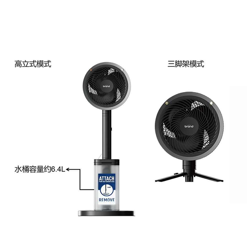 Integrated Misting with 6L water tank, Pedestal to Tabletop, Corded or Cordless, Up to 24-Hr Battery, Oscillating, Included remote control, with removeable rechargeable battery pack: #18650, 3.6V, 4X2000mAh, with AC Adaptor